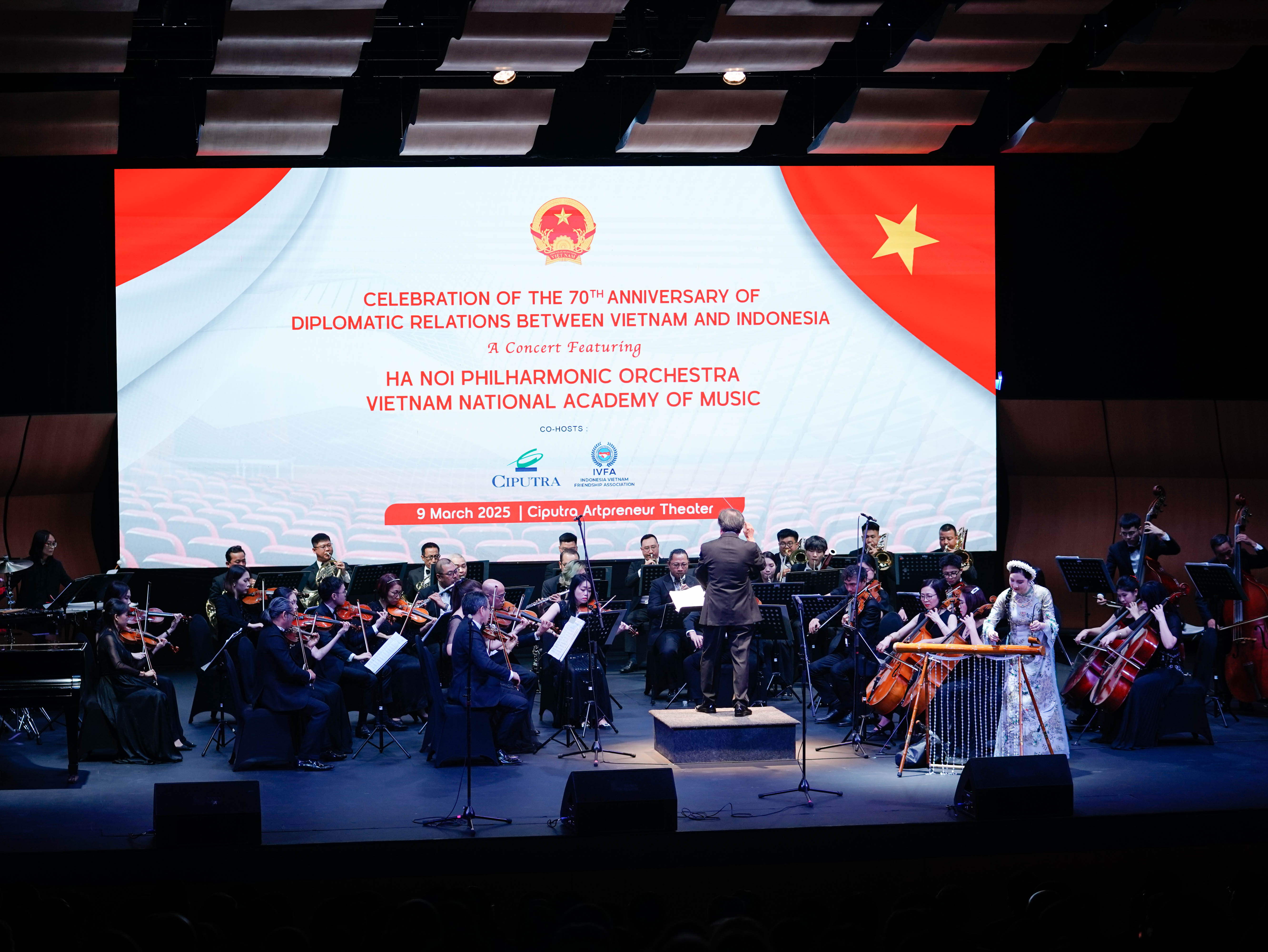The Hanoi Philharmonic Orchestra under the Vietnam National Academy of Music brought to the event performances by leading artists, introducing to Indonesian friends classical works from around the world, blending and interweaving with sounds characterised by traditional Vietnamese musical instruments, along with folk melodies and familiar songs from both countries./.